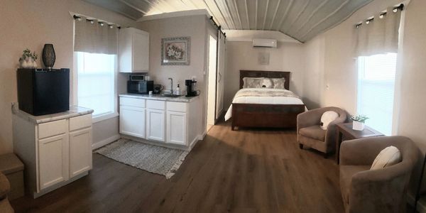 Each cabin will accommodate 2 people and is furnished with a queen-size bed, Livingroom area, full bathroom with shower and kitchenette!